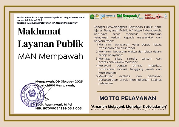 Madrasah Aliyah Negeri Mempawah mendukung adanya Reformasi Birokrasi dalam rangka mewujudkan Sistem Pemeritahan yang Baik (Good Governance) dimana hak-hak masyarakat dapat diperoleh secara maksimal. Oleh karenanya, kami terus berusaha untuk meningkatkan kualitas layanan, baik pelayanan terhadap siswa, guru, pegawai, maupun kepada publik (masyarakat umum).